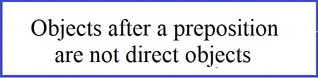 - Note however that objects after a preposition are not direct objects. They are in fact prepositional objects*.
